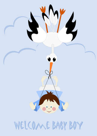 かわいい男の子をもたらすコウノトリと赤ちゃん到着カードのイラスト素材 ベクタ Image