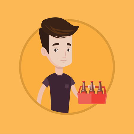 若い幸せな男がビールのパックを保持しています ビールのシックス パックを運ぶ陽気な男 白人男はビールを買います ベクター背景に分離されたサークルでフラットなデザイン イラスト のイラスト素材 ベクタ Image