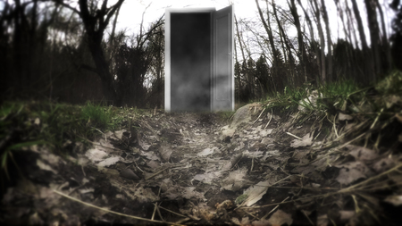 森の中で怖いドア ドアの神秘的な森 ヘイズと不思議な扉 の写真素材 画像素材 Image