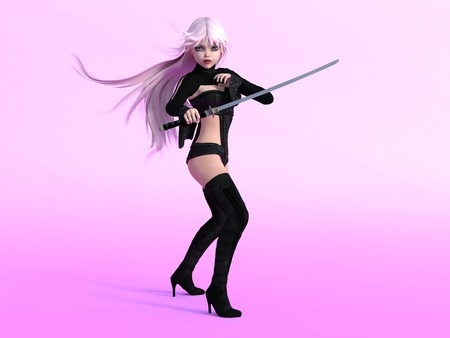 若いかわいい漫画の女の子が刀でポーズします ピンクの背景 の写真素材 画像素材 Image